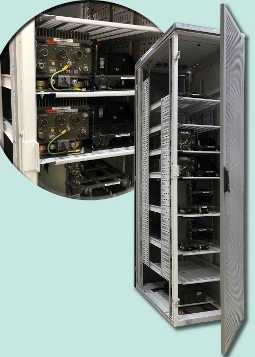 The IMRAKs are 47U high and 1000mm deep, fitted with a custom top panel with custom cable entries and a six-fan tray. Bespoke ventilated chassis trays, fully ventilated front and rear doors, power and signal distribution cabling and extensive earth bonding provide an electrically clean ready-to-run environment. The communications equipment under test is mounted into the fitted mounting plates, reducing set up time during the testing process.